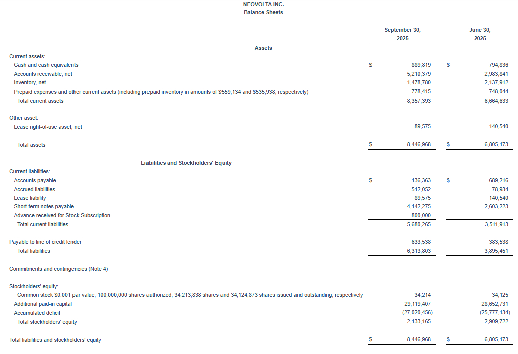 NeoVolta Inc. (NASDAQ:NEOV), a U.S.-based energy technology company delivering scalable storage, for resilient residential and commercial power infrastructure, today announced financial results for its first quarter of fiscal 2026, which ended September 30, 2025.