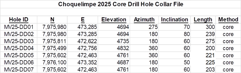 The 2025 Phase 3 drill campaign at Choquelimpie has successfully evaluated the down-dip extensions of higher-grade gold mineralization (>1 gram/tonne Au) hosted within hydrothermal breccia zones (Figure 1). Seven holes (7) core holes, for a total of approximately 1650 meters have been completed. The details of this program are shown on Figure 1 and Table 1 .